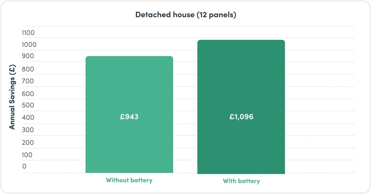 On a detached house, you could save up to £943 a year on your electricity bill by installing solar panels. Plus, if you add battery storage to the system, the potential saving increases by an extra 16% to a £1,096 a year - that's saving more than the average annual electricity bill for a home this size!